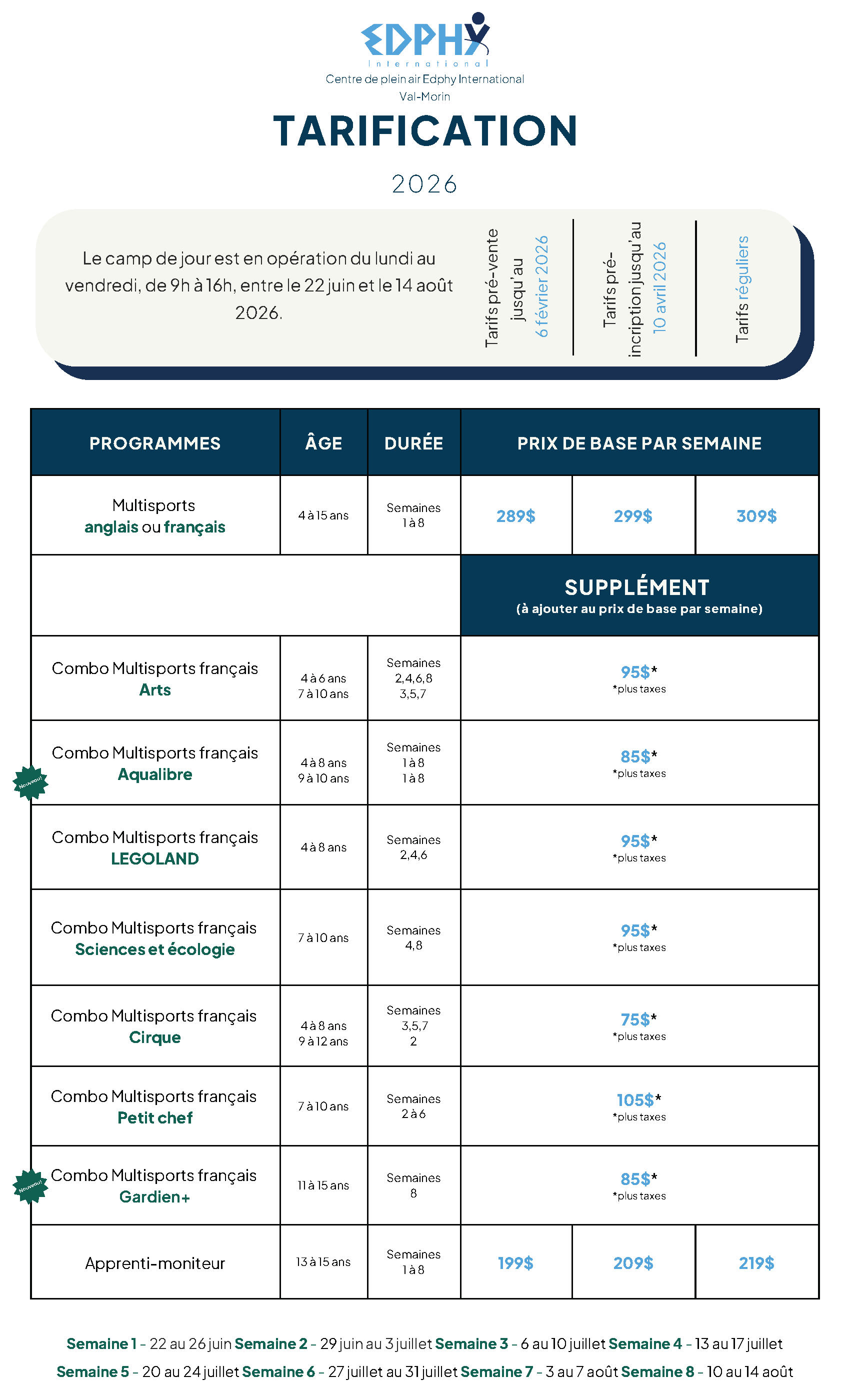 - Camp de jour régulier : Du 22 juin au 14 août 2026, du lundi au vendredi, de 9 h à 16 h.