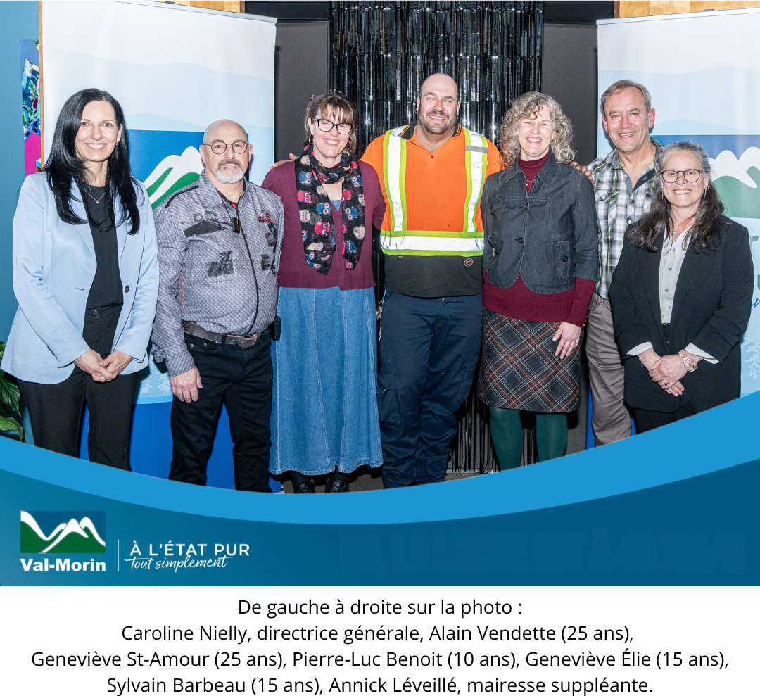 La Municipalité de Val-Morin a tenu, le 16 avril dernier, au Théâtre du Marais, une soirée toute spéciale consacrée à la reconnaissance de cinq employés municipaux ayant marqué l’organisation par leur engagement remarquable et leurs nombreuses années de service. Dans une atmosphère chaleureuse et profondément humaine étaient réunis collègues actuels ou anciens collaborateurs, élus municipaux, et membres des familles et amis afin de souligner le parcours exemplaire de ces femmes et de ces hommes qui contribuent, jour après jour, à faire de Val-Morin un milieu de vie réputé, et accueillant.